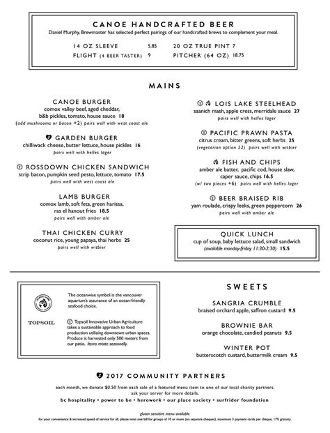 In conclusion, the Canoe Brewpub menu is a culinary adventure that offers something for everyone. From classic pub fare to more adventurous dishes, each item on the menu is made with care and attention to detail. With a focus on using fresh, locally sourced ingredients, the Canoe Brewpub menu is a celebration of the flavors of the Pacific Northwest. Whether you're a beer lover or a foodie, you're sure to find something to love on the Canoe Brewpub menu.